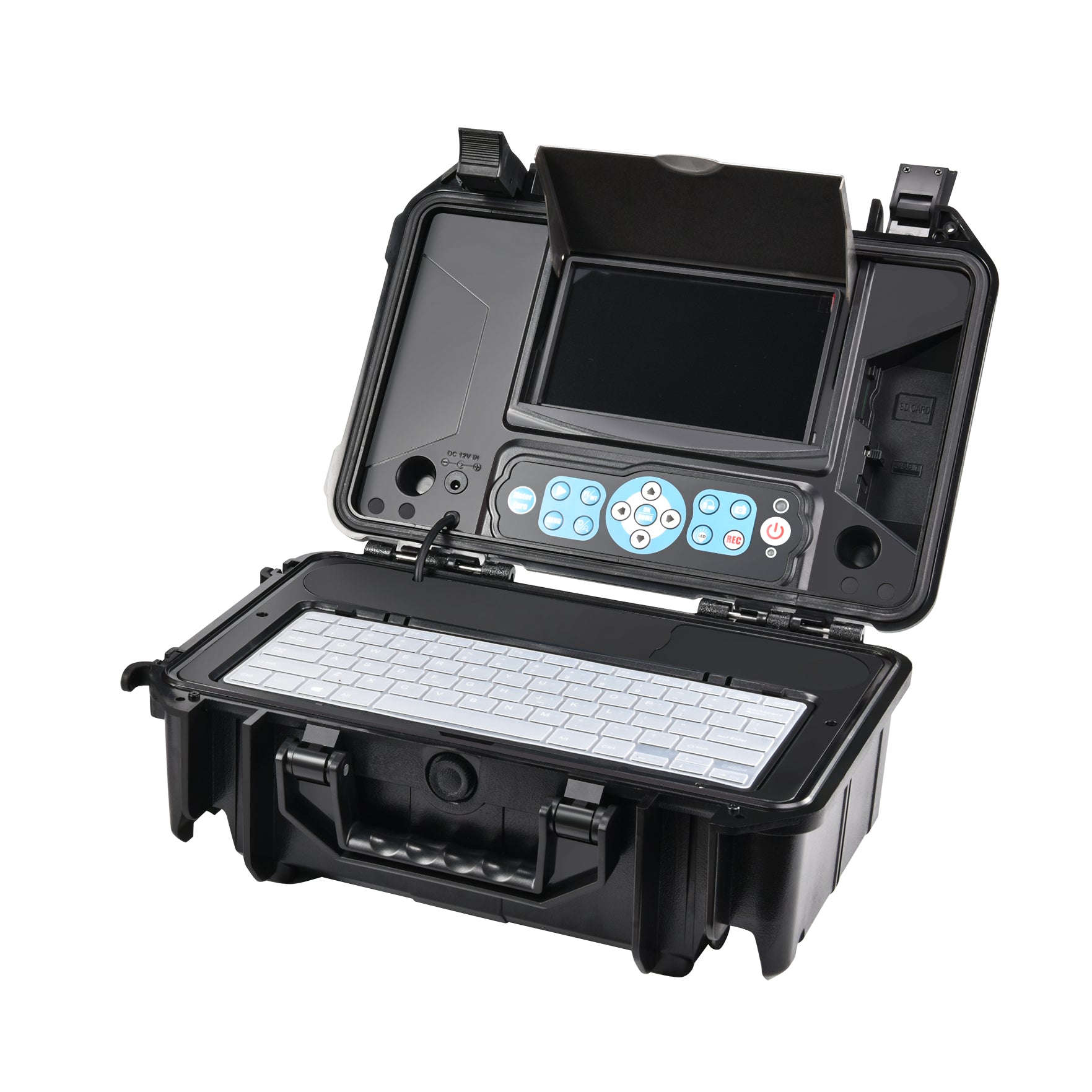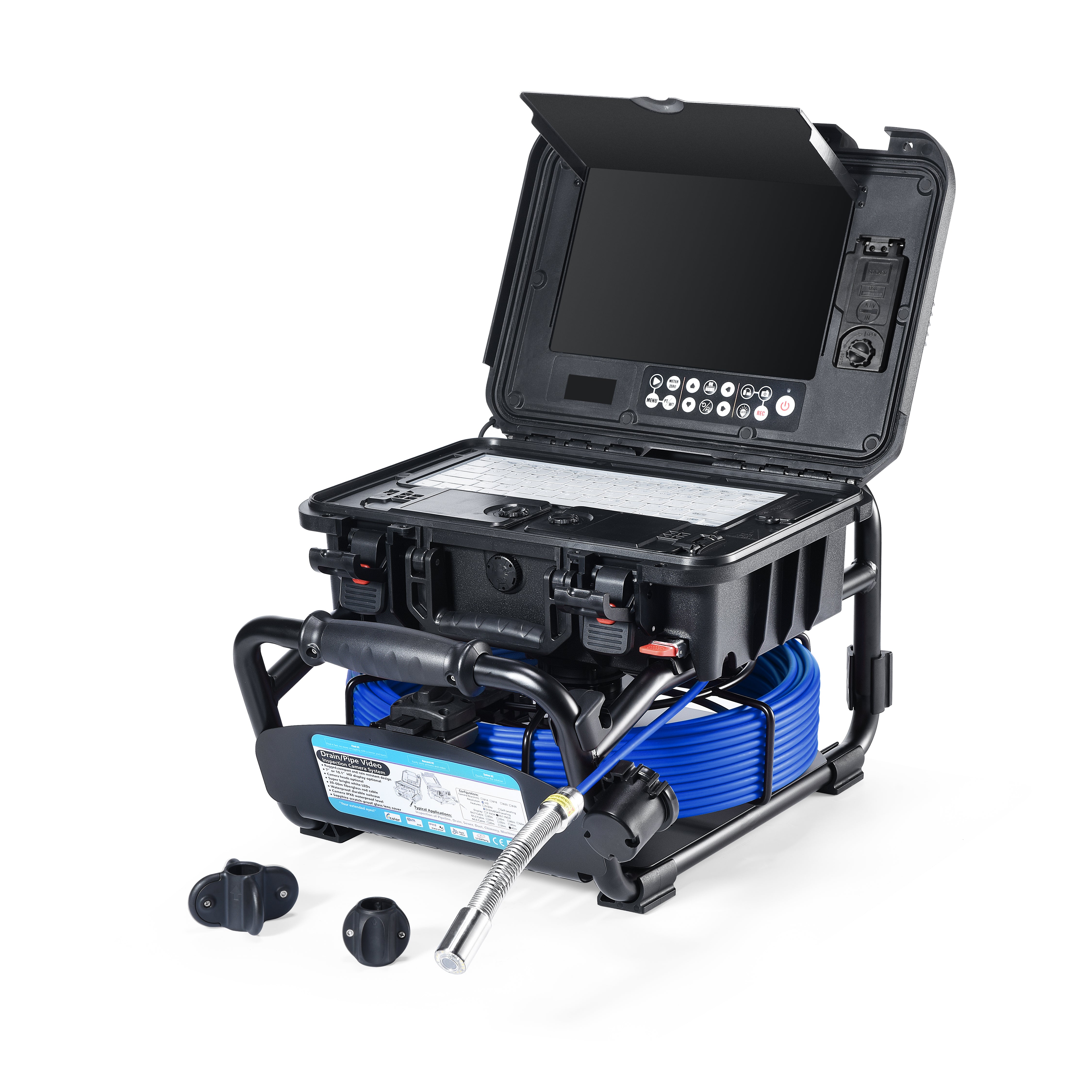 Das Bild wird auf einem großen 10" spritzwassergeschützten LCD-Farbmonitor mit Bildrotationsfunktion, On-Screen-Längenmessung (Meter/Fuß) sowie Anzeige von Datum und Uhrzeit dargestellt. Über die integrierte wasserdichte Tastatur (englisch) können während der Inspektion direkt Texte eingegeben werden. Fotos und Videos – inklusive lokalem Audio über das integrierte Mikrofon – werden auf einer SD-Karte gespeichert, die sicher in wasserdichten Staufächern im Koffer untergebracht ist.